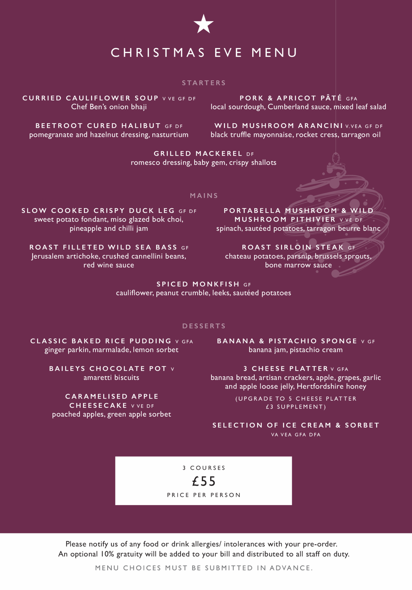 Our Chefs have crafted an indulgent 3 course menu exclusively for Christmas Eve, designed to get you in the festive spirit before the ‘Big Day’.