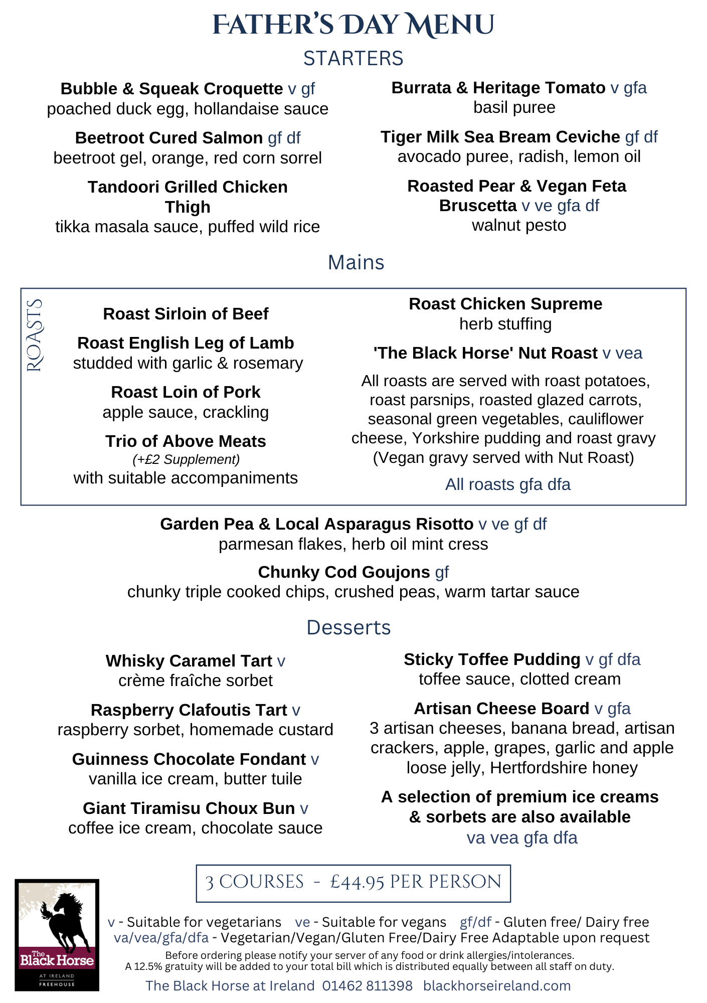 Our fantastic 3 course menu is created especially for the day and offers a selection of tasty starters, delicious traditional roasts and main dishes and delectable desserts.  With a separate Children’s Father’s Day Menu also available, offering kid-friendly dishes individually priced, The Black Horse is the perfect venue for the whole family to celebrate Father’s Day.