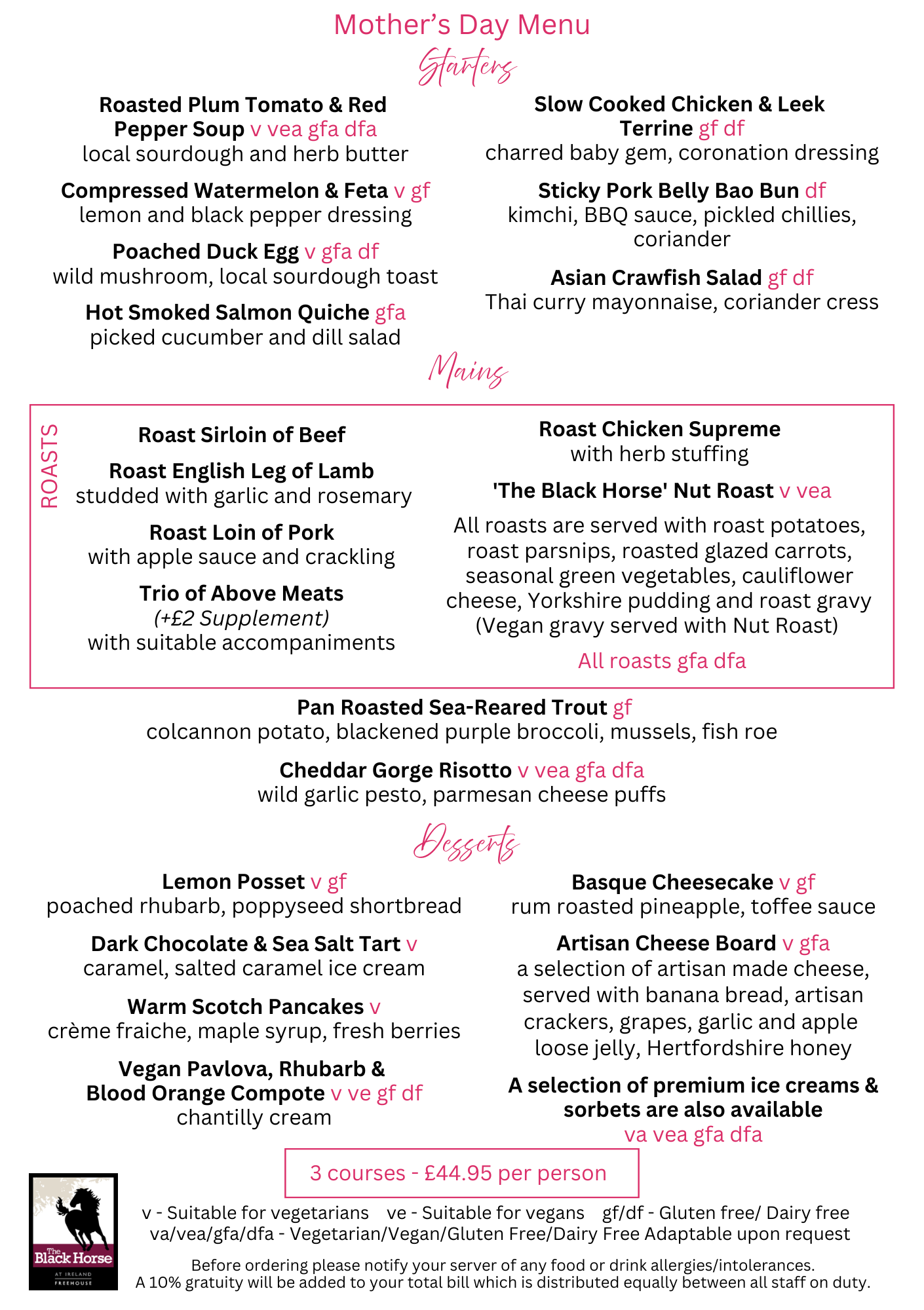 Our fabulous 3 course set price Mother’s Day menu offers a great choice of delicious dishes, including our tasty traditional Sunday roasts. With our additional Children’s Mother’s Day Menu offering kid-friendly dishes individually priced, The Black Horse is the perfect place for the whole family to celebrate Mother’s Day.
